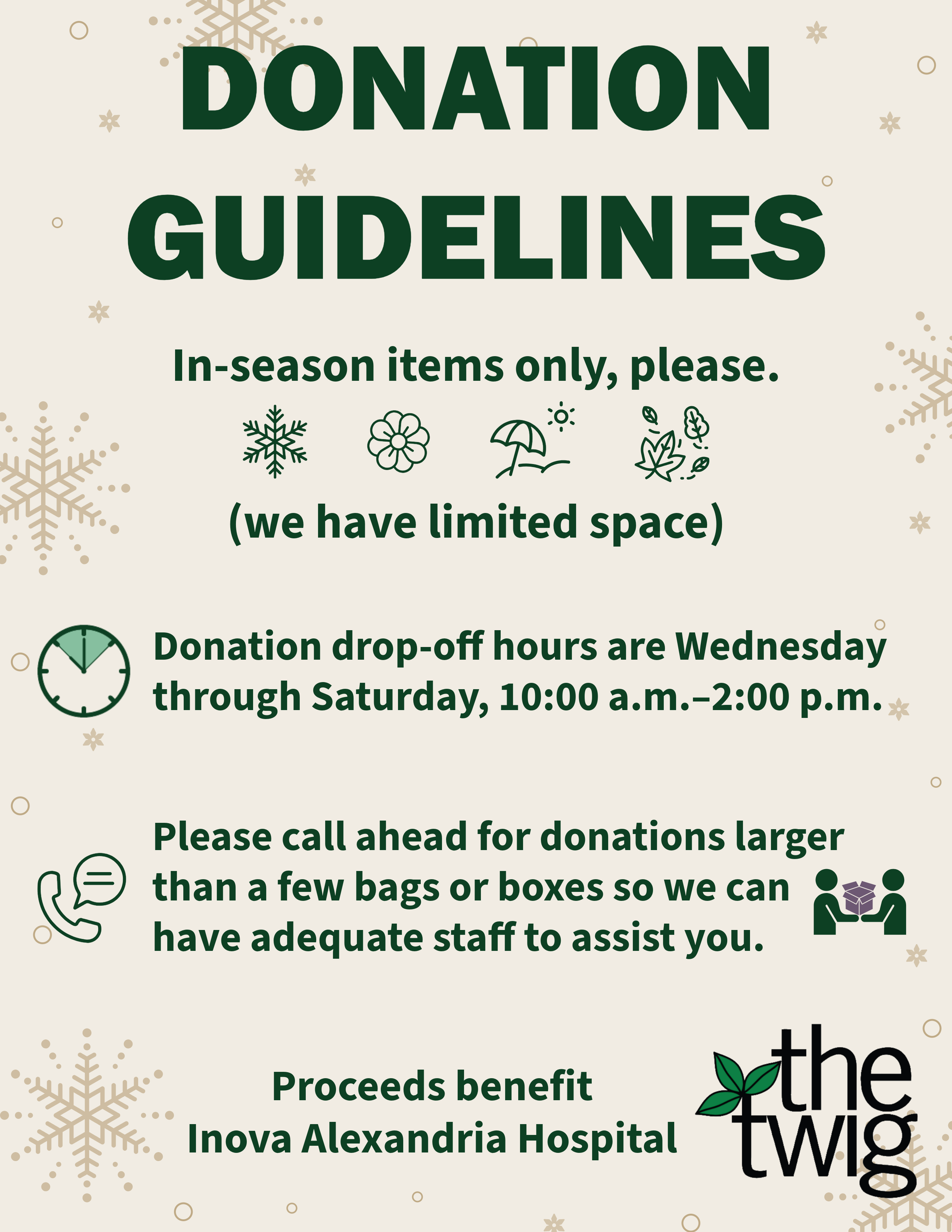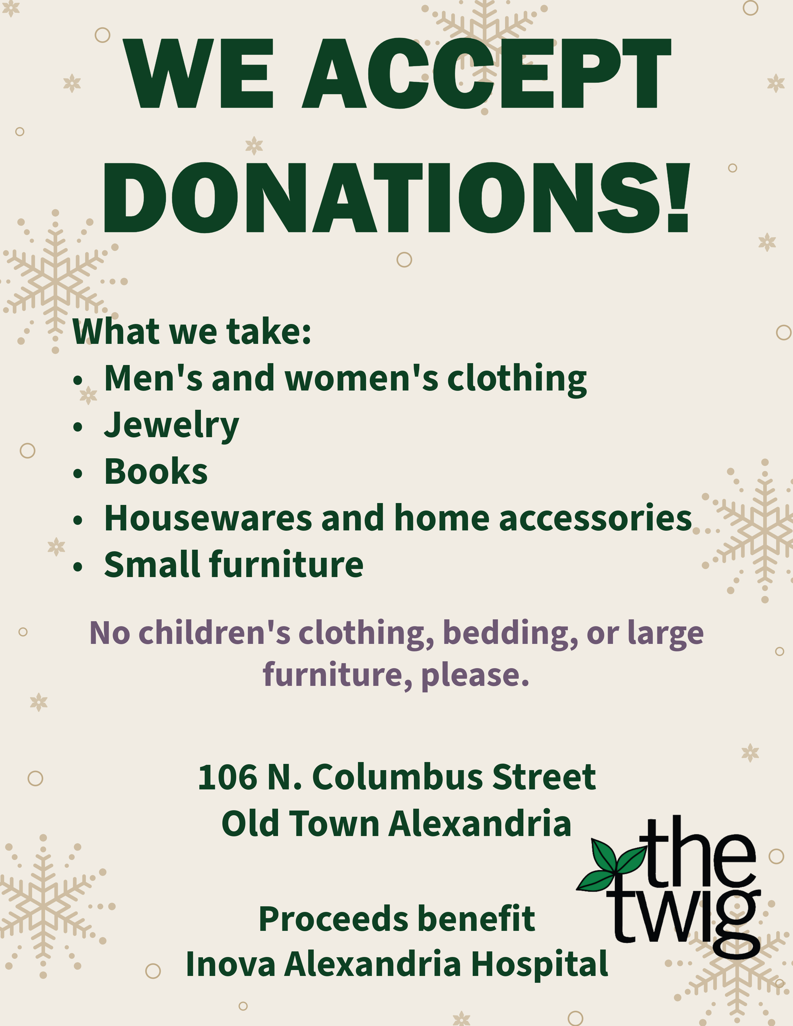 The Twig Thrift Shop, located in Old Town Alexandria at 106 N. Columbus Street, specializes in quality clothing and accessories for women and men, as well as housewares and books. Our all-volunteer staff is eager to help you find affordable treasures. Proceeds benefit the Inova Alexandria Hospital.